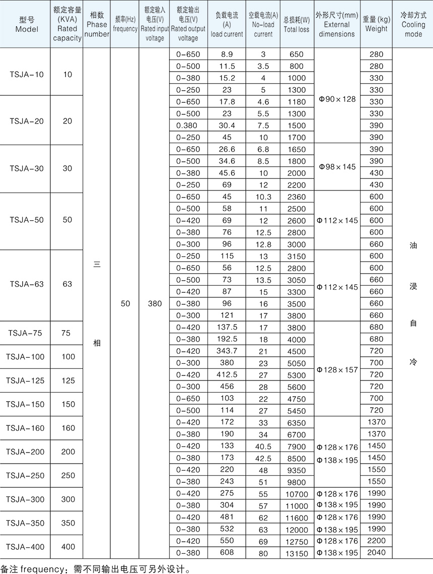 TDJA、TSJA系列單、三相油浸自冷感應調(diào)壓器(穩(wěn)壓器)能在帶負荷情況下,無級、平滑、連續(xù)地調(diào)節(jié)輸出電壓。主要用于電機電器試 驗、電爐控溫、整流設(shè)備配套、發(fā)電機勵磁等,在機械制造、化工、紡織、通訊、軍工等行業(yè) 得到廣泛應用。 TDJA、TSJA型油浸式調(diào)壓器采用斜槽新工藝,波形好,達到IEC 標準對電器試驗電源的 要求,該系列產(chǎn)品可平滑、無級地調(diào)節(jié)負載電壓,輸出電壓波形畸變小,壽命長、運行可靠, 使用、維護方便、損耗低、過載能力強,具有兩種調(diào)壓速度,是電機、變壓器和其他電器 最 理想的可調(diào)電源。