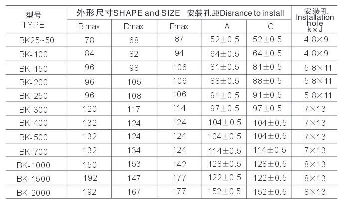 BK系列機床控制變壓器(以下簡稱變壓器)適用50-60Hz電壓至500V的電路中,通常用作機床控制電器或局部照明燈及指示燈的電源之用。BK變壓器結(jié)構(gòu)可分為殼式;按安裝方式可分為立式。旗正牌BK控制變壓器型號具體已列下圖里,詳情看下圖!